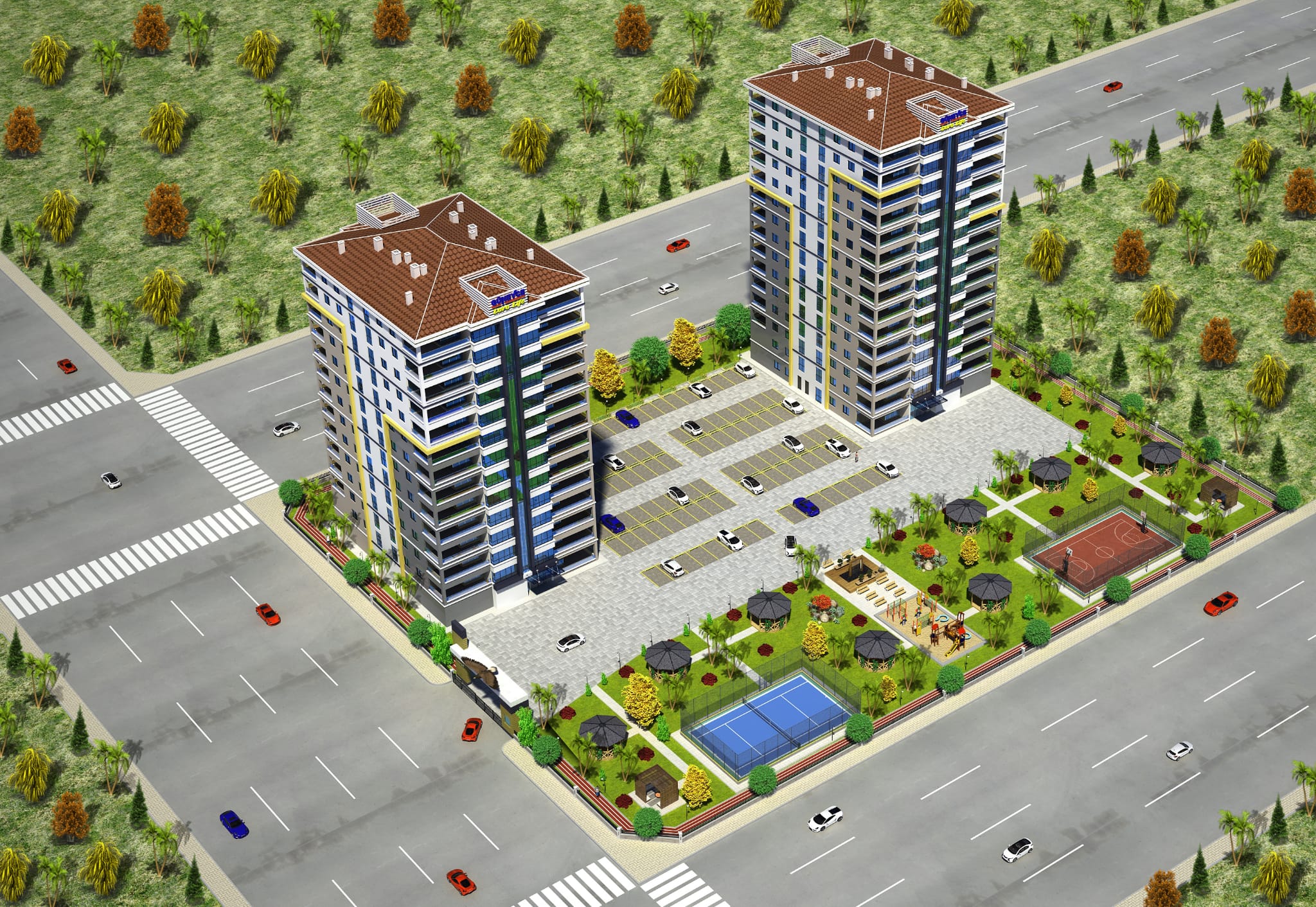BASKET SAHASI-ÇOCUK OYUN ALANLARI-KAMELYALAR-SOSYAL ALANLAR VE HARİKA PEYZAJ ALANLARI